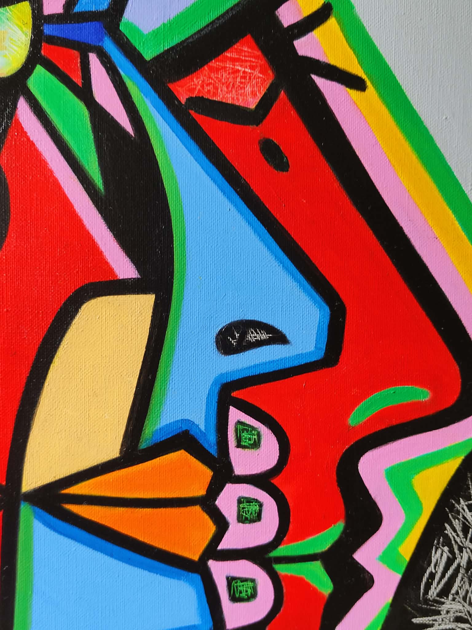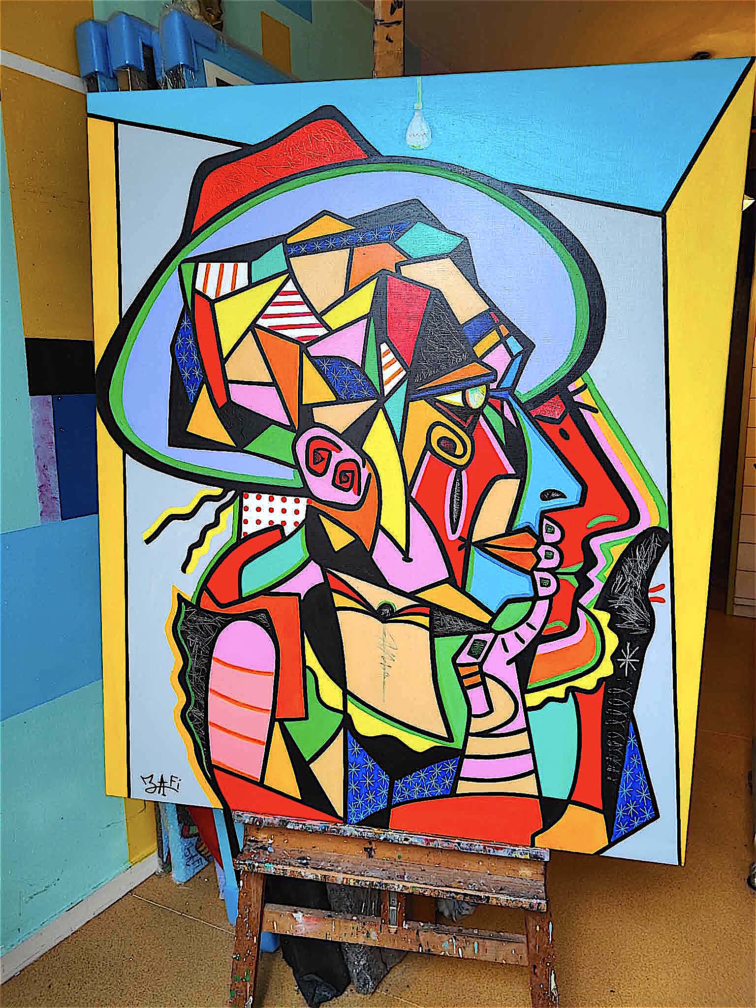 " On reconnaît un chef de file à ceux qui marchent dans son sillage..."Les portraits de Zafi s'inscrivent dans une recherche plastique et picturale personnelle, construite au fil du temps, où certaines formes et fragments sont devenus une signature.Une écriture visuelle qui continue de voyager au-delà même ses propres toiles où certains détails de son art ont su s'imposés comme un véritable langage jusqu'à trouver échos dans d'autres mains et regard.C'est le signe q'un style est né, celui de ZAFI.Oeuvre unique